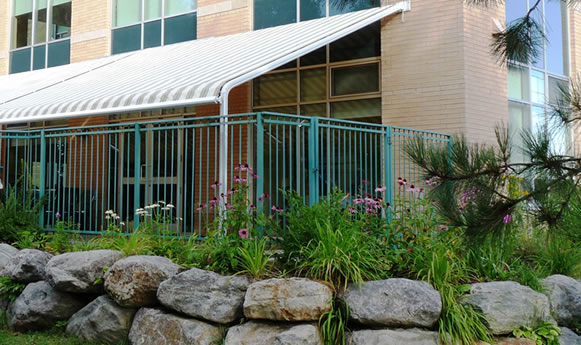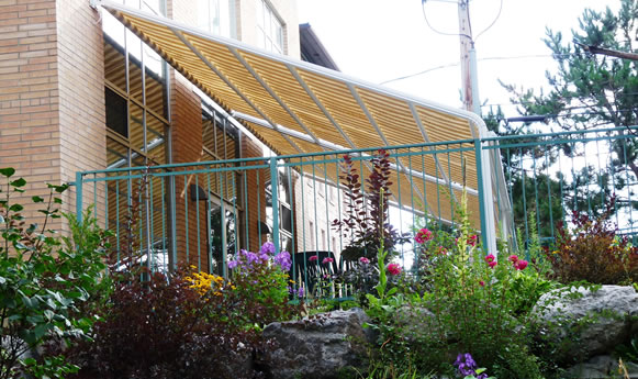 Different than retractable awnings, this awning is modular and allows coverage of large surfaces over a terrace. Because it is fixed to the ground and very rigid, it is perfect for windy areas.